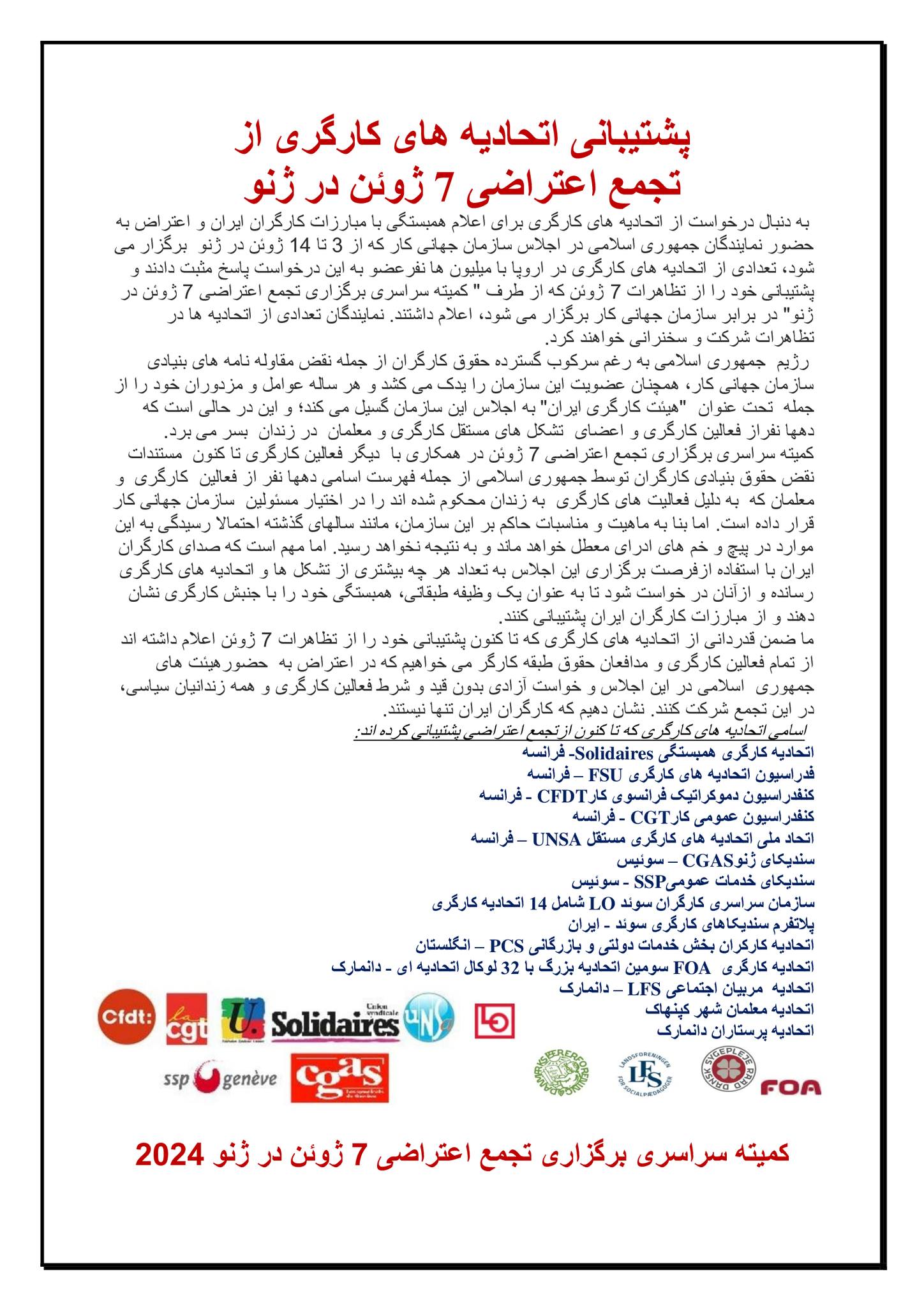 پشتیبانی اتحادیه های کارگری از تجمع اعتراضی هفتم ژوئن در ژنو Continue Reading Previous: اعتراض شورای همکاری نیروهای چپ و کمونیست به حضور شوراهای اسلامی در اجلاس سازمان جهانی کارNext: نامهی سرگشادهی کارگران زندانی، رضا شهابی و داود رضوی، به نمایندگان تشکلات کارگری جهان در صد و دوازدهمین کنفرانس سازمان بین المللی کار دیدگاهتان را بنویسید لغو پاسخنشانی ایمیل شما منتشر نخواهد شد. بخشهای موردنیاز علامتگذاری شدهاند *دیدگاه نام * ایمیل * وبسایت ذخیره نام، ایمیل و وبسایت من در مرورگر برای زمانی که دوباره دیدگاهی مینویسم.